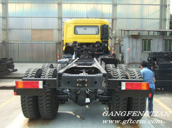 DFL3251A7-K49D-000-040J 6×4驅(qū)動(dòng),D310平頭標(biāo)準(zhǔn)頂駕駛室,玉柴YC6M290-33發(fā)動(dòng)機(jī)(EGR),軸距4600+1350mm,,車架前寬940mm,車架后寬860mm,加裝節(jié)油控制閥及節(jié)油開關(guān)控制,火焰預(yù)熱冷起動(dòng)裝置,全鋼350L燃油箱,有燃油箱鎖(三鎖合一),機(jī)械油門踏板及開關(guān),有廢氣引射排塵裝置,消聲器側(cè)置排氣口朝向側(cè)吹,Φ430mm拉式膜片彈簧離合器,陜齒9檔9JS119變速箱(頭檔速比12.11),最高檔為直接檔,東風(fēng)7T前橋,13T輪邊減速雙后橋(加強(qiáng)型制動(dòng)器,加強(qiáng)型制動(dòng)鼓),主減速比5.26,有輪間差速鎖,部分功率取力器(在變速箱上取力),有自卸舉升裝置(帶慢降裝置),車架縱梁斷面300×90×(8+8)mm,鋼板彈簧片數(shù)9/13,12.00R20子午胎(一般橫向花紋),手動(dòng)調(diào)整臂,無ABS,半浮后懸機(jī)械減震駕駛室懸置,液壓機(jī)械翻轉(zhuǎn),無色鋼化前風(fēng)窗玻璃,通道式儀表板,裝空調(diào)。